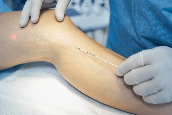 - Эндовенозная лазерная коагуляция (ЭВЛК): Это «золотой стандарт» в лечении варикоза. Через небольшой прокол в вену вводится тонкий лазерный световод. Под действием тепловой энергии лазера пораженная вена «запаивается» изнутри, и кровоток перенаправляется по здоровым сосудам. Процедура проводится под местной анестезией, длится около 30-60 минут и не требует госпитализации.